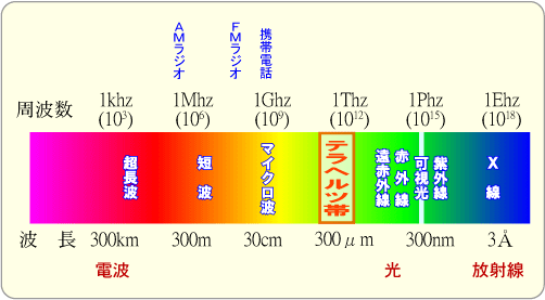 周波数が10の12乗(1兆=テラ)Hzであることから、テラヘルツ光という名前で呼ばれています。
